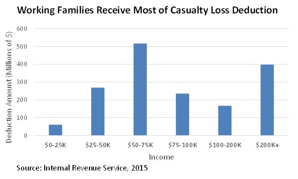 Households claimed $1.6 billion in casualty losses in 2015, including over $1 billion by households making under $100,000. The Senate GOP tax plan shifts the burden onto families suffering losses from theft or natural disasters to pay for tax giveaways to large corporations and the very wealthy. The Senate plan would restrict the casualty loss deduction to disasters that receive a Presidential Disaster Declaration (PDD), which will leave out many families.
