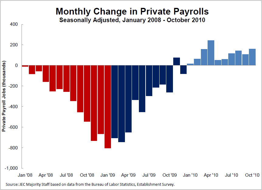 “As this latest jobs report shows, we are making steady progress, and our economy is in better shape than a year ago. The policies put in place during the past two years have strengthened our economy and laid the foundation for future growth. We now have ten straight months of private sector job gains, and for the first time since May, the economy saw an increase in total nonfarm jobs. This October, we added 159,000 private sector jobs, compared to losing 262,000 private sector jobs last October.