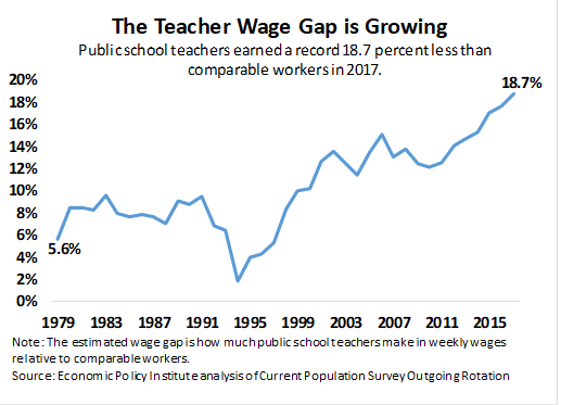 Teachers play a vital role in shaping children’s ability to succeed in the 21st century economy. But over the last few decades, teacher pay has eroded relative to comparable workers. The gap between what public school teachers earn and what similar professionals earn has grown just about every year over the last decade. In 1994, public school teachers earned just about 2 percent less than comparable workers. Today, that gap has grown to 18.7 percent. Raising teacher pay so that our nation’s teachers can earn a decent living is critical to recruiting and retaining the high-quality, effective teaching workforce American children deserve.