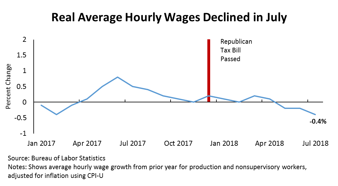 The average hourly wage for production and nonsupervisory workers—our best measure of the median workers’ take home pay—was lower in July 2018 than it was in July 2017, after adjusting for inflation. This is the third straight month of year-to-year declines in real wages. Seven months since the Republican tax law took effect, it’s not clear how much longer American workers are supposed to wait before they see the raises President Trump promised them.