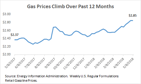 Gas prices have increased almost 50 cents a gallon in the past 12 months, reaching their highest levels since 2015, and are poised to jump higher if President Trump pulls out of the nuclear agreement with Iran when it comes up for renewal this week.