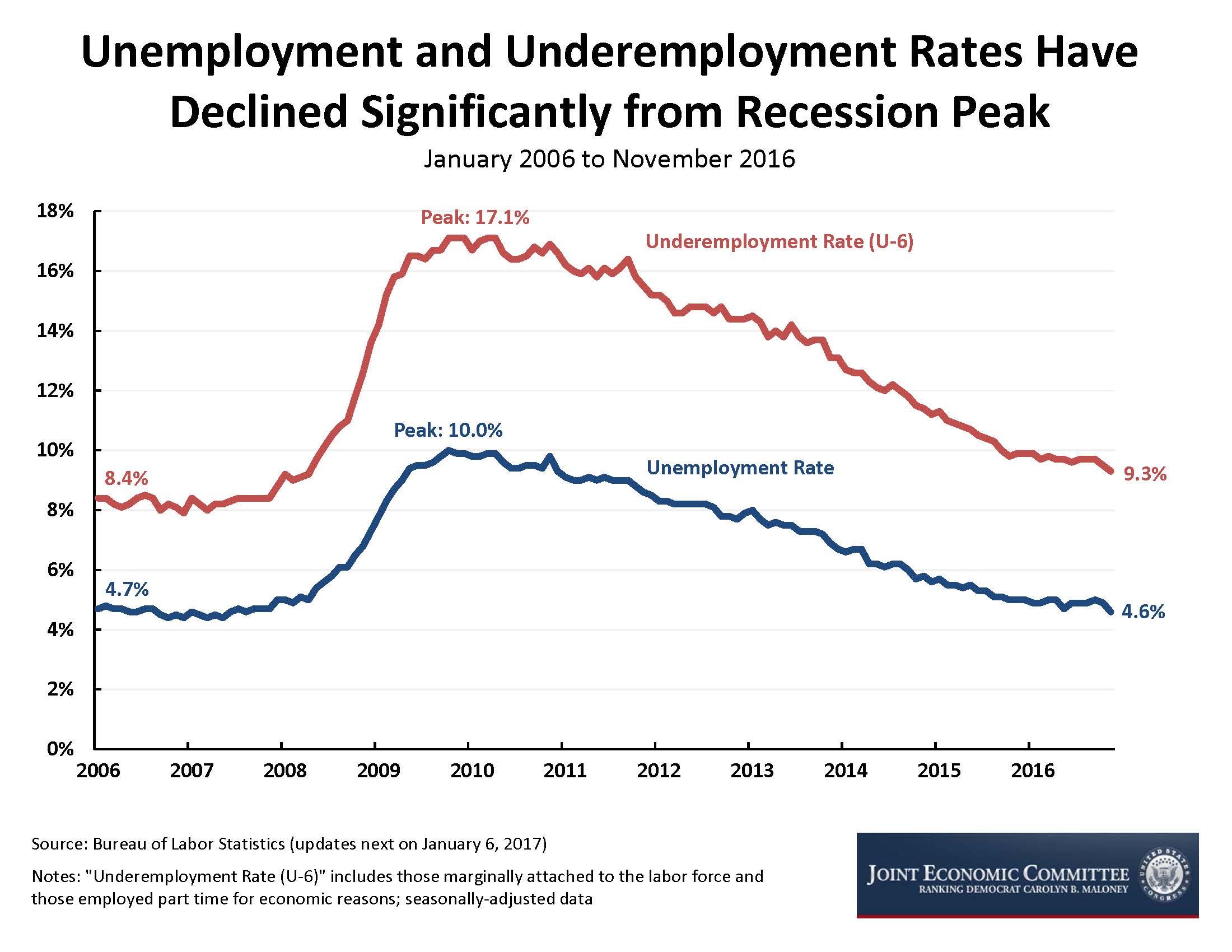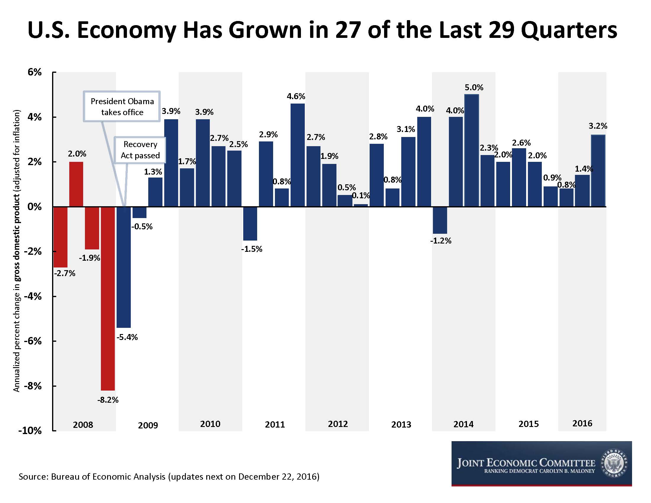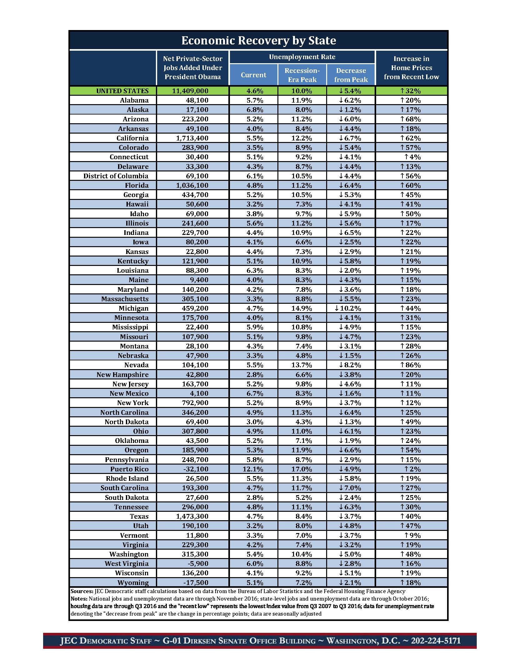 The short report, prepared by the Democratic staff of the U.S. Congress Joint Economic Committee (JEC) includes economic data that tracks key indicators in all 50 states, including private-sector job growth, unemployment and home prices.