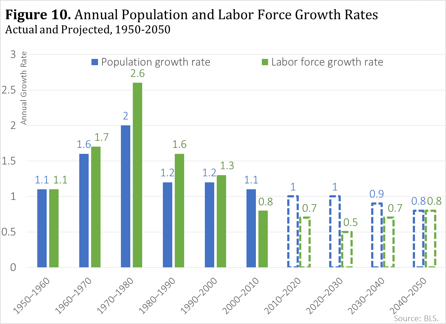 In the United States and abroad, populations continue to age, even prompting China to lift its one-child policy in the hopes of mitigating a shrinking workforce.[70] Demographic changes related to aging and birth rates will continue to be a factor in labor force participation projections for most large industrialized countries for the next several decades. According to BLS, annual growth in the labor force is expected to slow to just under 0.7 percent from 2000 to 2050, down significantly from the 1.4 percent rate seen from 1950 to 2000. [71] The annual growth rate by decade is shown in Figure 10. However, compared to other countries, the United States remains “demographically fortunate” over the long term given that its workforce is expected to grow 10 percent by 2050—significantly slower than the historical pace, but at least a positive trend nonetheless.[72] By contrast, other advanced economies are expected to see their workforces shrink by at least one-quarter in many cases over the same time frame.